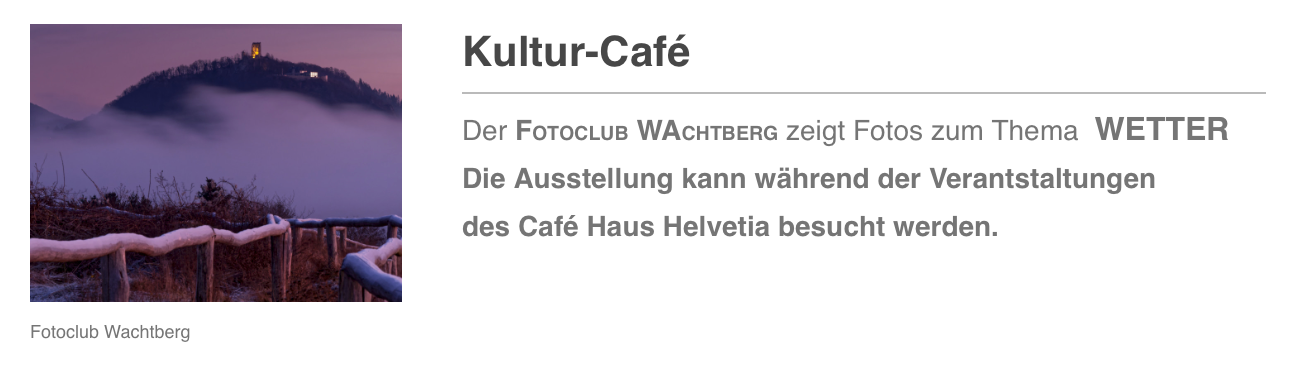März bis April 2023 - Gemeinschaftsausstellung mit dem Fotoclub Wachtberg zum Thema "Wetter" im Kultur Cafe Haus Helvetia Wachtberg.