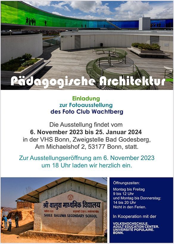 November 2023 - Januar 2024 Gemeinschaftsausstellung "Pädagogische Architektur" mit dem Fotoclub Wachtberg in der VHS Bonn Bad Godesberg.